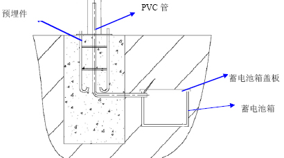 2、4、地基預(yù)埋件放入地基澆筑坑的中間,將PVC塑料管的一端放在蓄電池箱內(nèi),在將PVC塑料管的另一端放在基礎(chǔ)結(jié)構(gòu)件固定底版中心穿出0.2米。一切準備就緒,用C20混凝土澆灌后用震動棒震動即可。