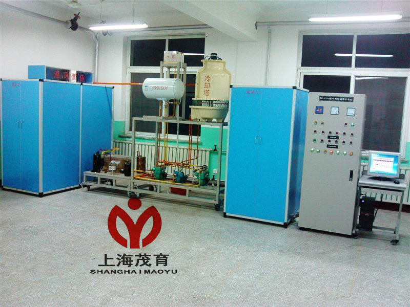中央空調(diào)教學實訓臺,中央空調(diào)教學實訓裝置,中央空調(diào)教學實訓設(shè)備采用6匹水冷機組,不銹鋼框架結(jié)構(gòu),終端建立一個專門房間進行客戶的模擬,大廳的模擬直接利用教室原來空間,采用分水器和集水器對冷量或熱量進行分配調(diào)節(jié),整個中央空調(diào)采用三菱FX2n-48MR PLC可編程控制器及工業(yè)總線控制,由計算機通過通信總線與PLC進行通信,控制整個中央空調(diào)的運行?照{(diào)的運行參數(shù)由各類傳感器進行采集,并通過通信總線送入計算機中,通過專用中央空調(diào)組態(tài)控制軟件進行實時監(jiān)控。組態(tài)軟件要求能夠以動畫的形式同步顯示系統(tǒng)的設(shè)備結(jié)構(gòu)、控制原理和流程。