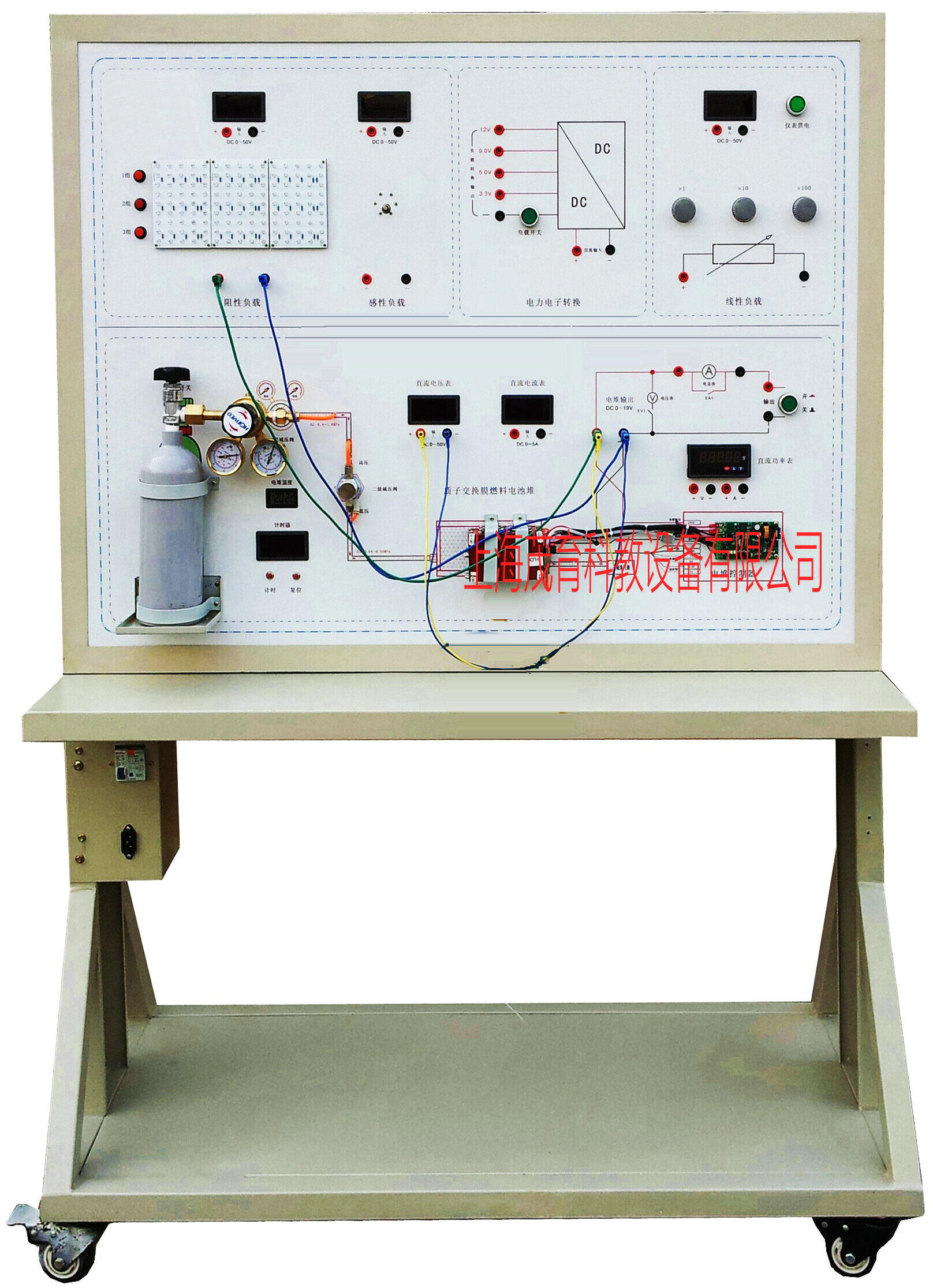 示教板采用點火開關(guān)、燃料電池(氫氣)、直流電動機(jī)、發(fā)光二極管組件、制動開關(guān)等。12V開關(guān)電源、大型彩色噴繪電路原理圖、控制面板、可移動臺架、使用說明書及實訓(xùn)指導(dǎo)書等。
